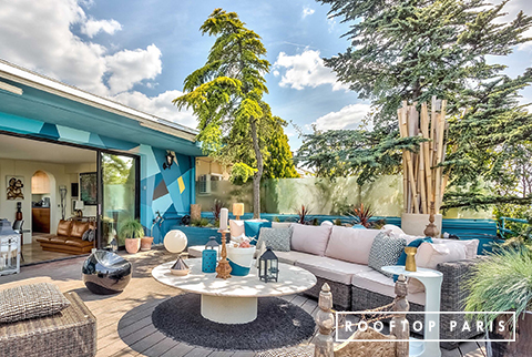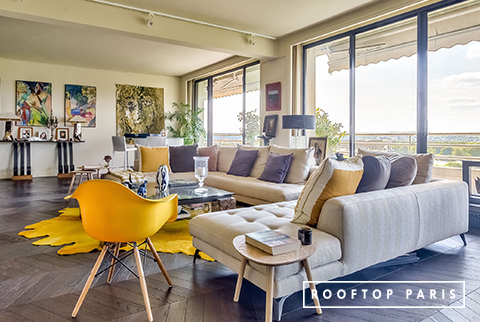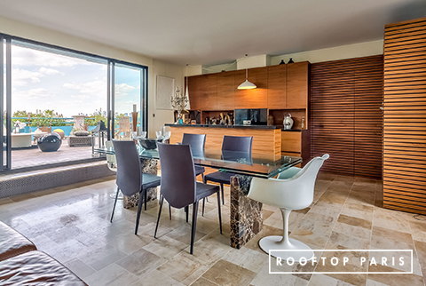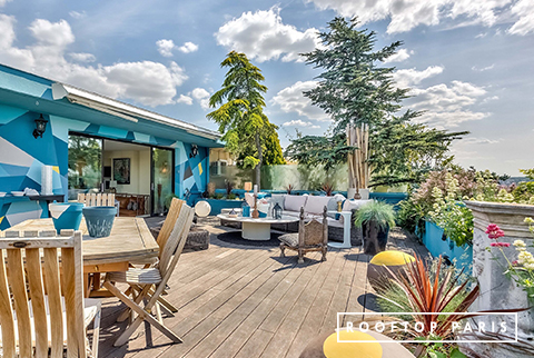 On the first floor, the kitchen opens onto a double terrace, one with a view of Paris and the Eiffel Tower, the other with a view of the Auteuil racecourse. The ethnic decoration and the blue tones offer a summery decor for your lunch and dinner cocktails. The different views offer an ideal setting for your photo and video shoots.